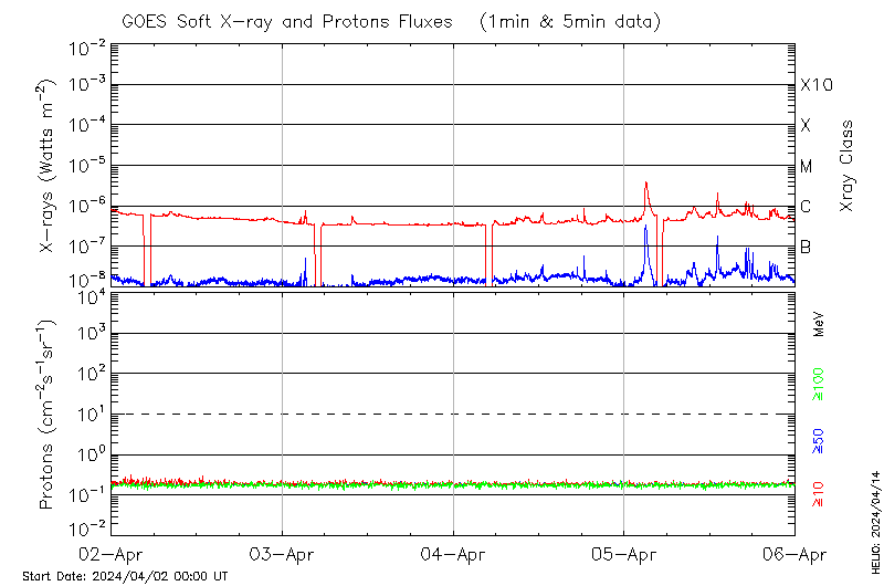 This page provides light-curves generated from GOES soft X-ray and Particle data for the date indicated at the top and the preceding three days.
