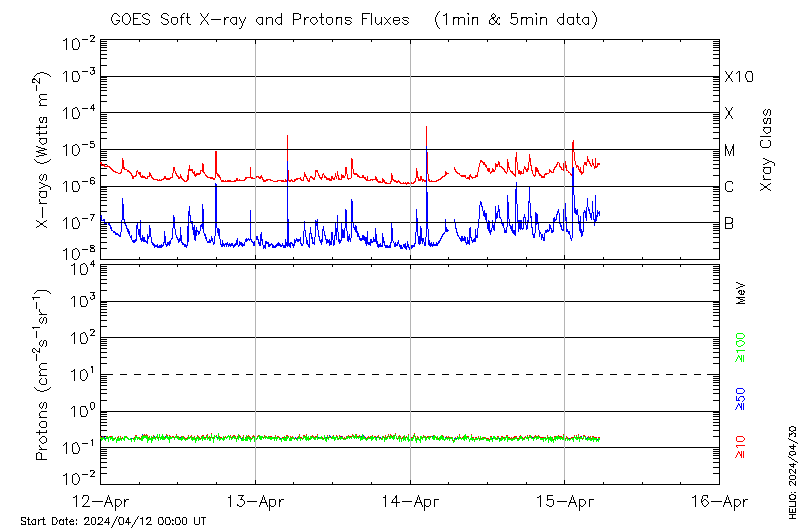 This page provides light-curves generated from GOES soft X-ray and Particle data for the date indicated at the top and the preceding three days.