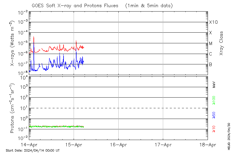 This page provides light-curves generated from GOES soft X-ray and Particle data for the date indicated at the top and the preceding three days.