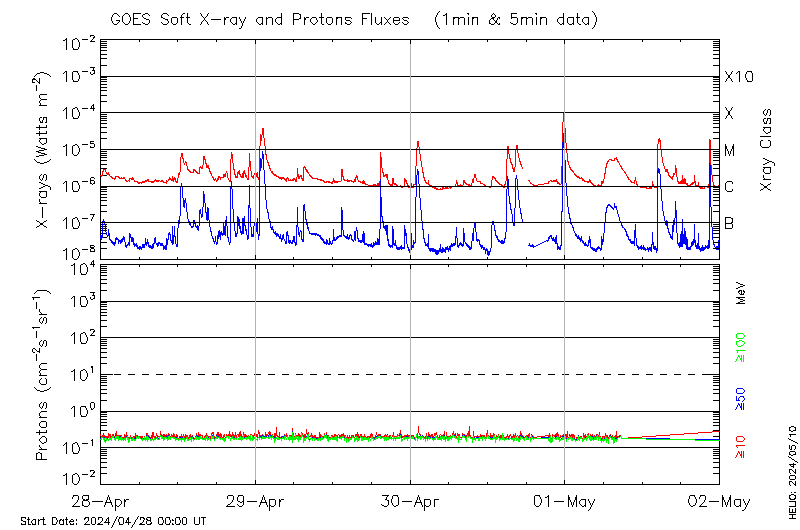 This page provides light-curves generated from GOES soft X-ray and Particle data for the date indicated at the top and the preceding three days.