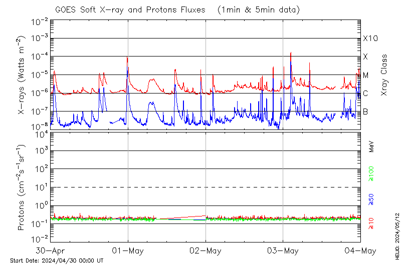 This page provides light-curves generated from GOES soft X-ray and Particle data for the date indicated at the top and the preceding three days.