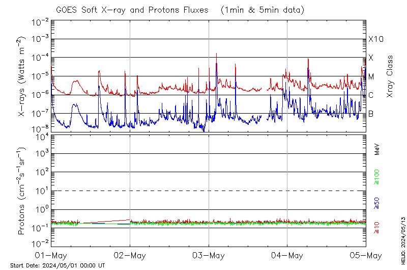 This page provides light-curves generated from GOES soft X-ray and Particle data for the date indicated at the top and the preceding three days.