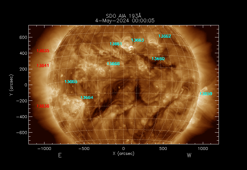 Click on an Active Region plot to display the Region Report including the region evolution and flaring history. HEC Search for NOAA Active Regions (SRS) records for this date and the day before.