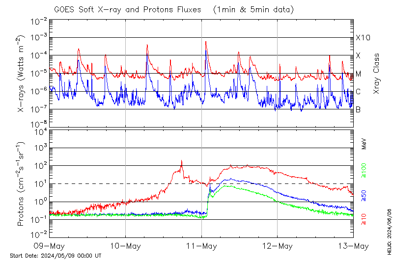 This page provides light-curves generated from GOES soft X-ray and Particle data for the date indicated at the top and the preceding three days.