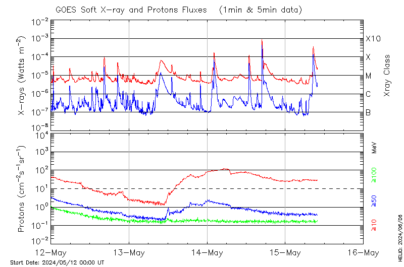 This page provides light-curves generated from GOES soft X-ray and Particle data for the date indicated at the top and the preceding three days.