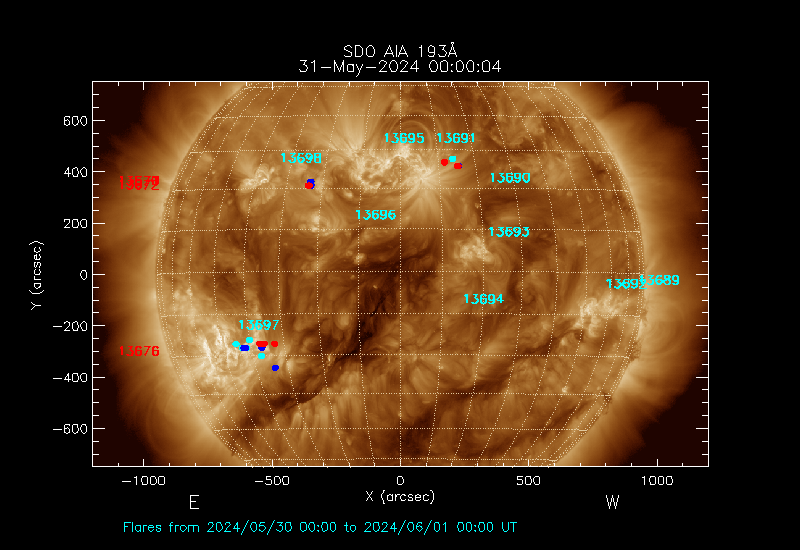 The most recent flares (≤12 hours) are shown as red dots, 12-24 hours ago as blue dots and older ones as turquoise dots.