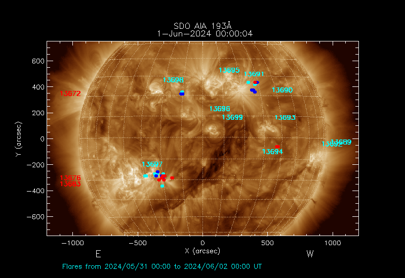 The most recent flares (≤12 hours) are shown as red dots, 12-24 hours ago as blue dots and older ones as turquoise dots.