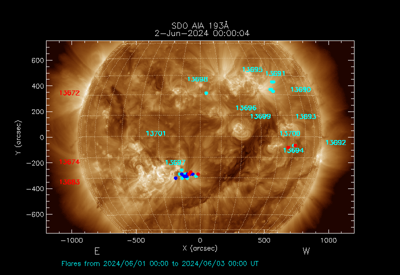 The most recent flares (≤12 hours) are shown as red dots, 12-24 hours ago as blue dots and older ones as turquoise dots.