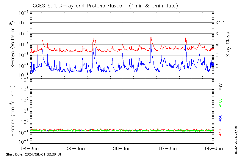 This page provides light-curves generated from GOES soft X-ray and Particle data for the date indicated at the top and the preceding three days.
