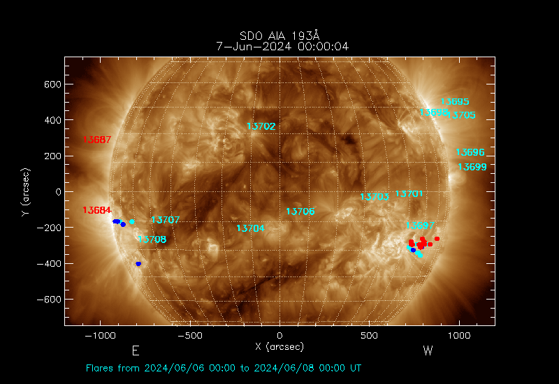 The most recent flares (≤12 hours) are shown as red dots, 12-24 hours ago as blue dots and older ones as turquoise dots.