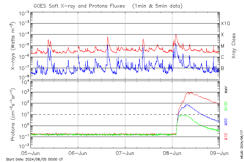This page provides light-curves generated from GOES soft X-ray and Particle data for the date indicated at the top and the preceding three days.