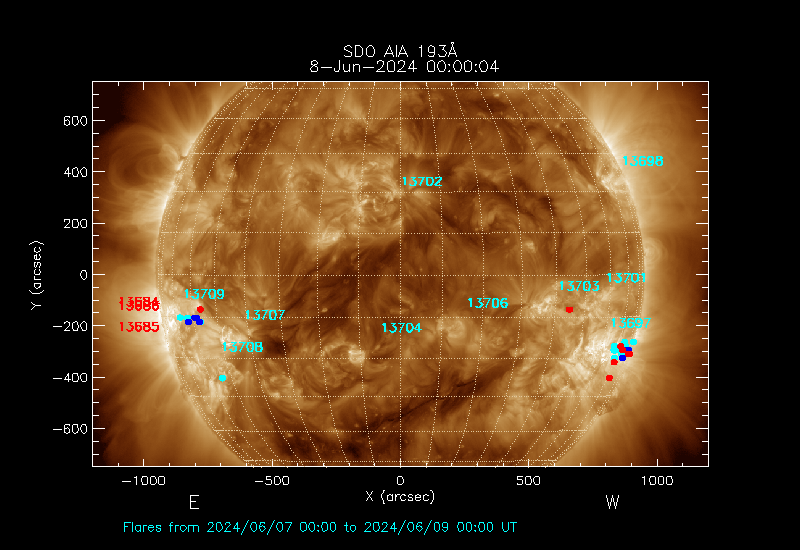 The most recent flares (≤12 hours) are shown as red dots, 12-24 hours ago as blue dots and older ones as turquoise dots.