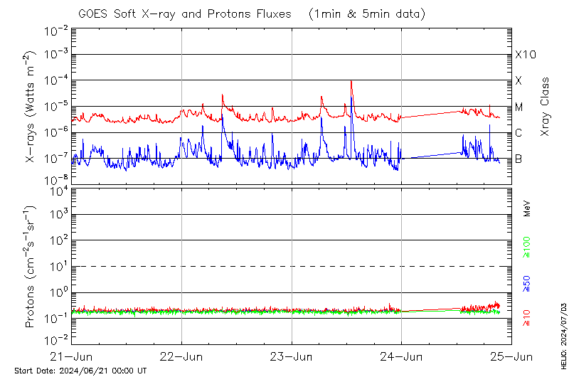 This page provides light-curves generated from GOES soft X-ray and Particle data for the date indicated at the top and the preceding three days.