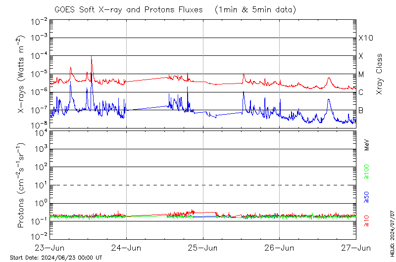 This page provides light-curves generated from GOES soft X-ray and Particle data for the date indicated at the top and the preceding three days.