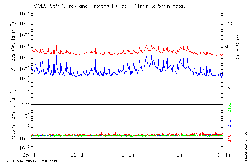 This page provides light-curves generated from GOES soft X-ray and Particle data for the date indicated at the top and the preceding three days.