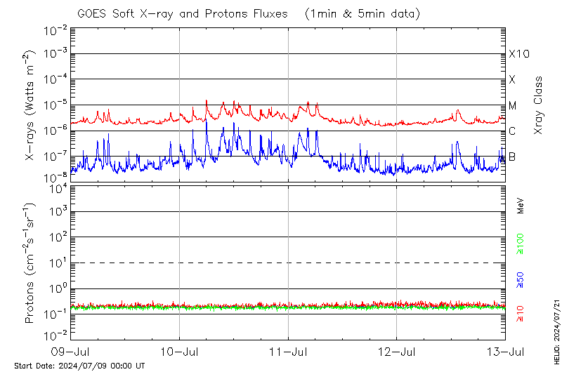 This page provides light-curves generated from GOES soft X-ray and Particle data for the date indicated at the top and the preceding three days.
