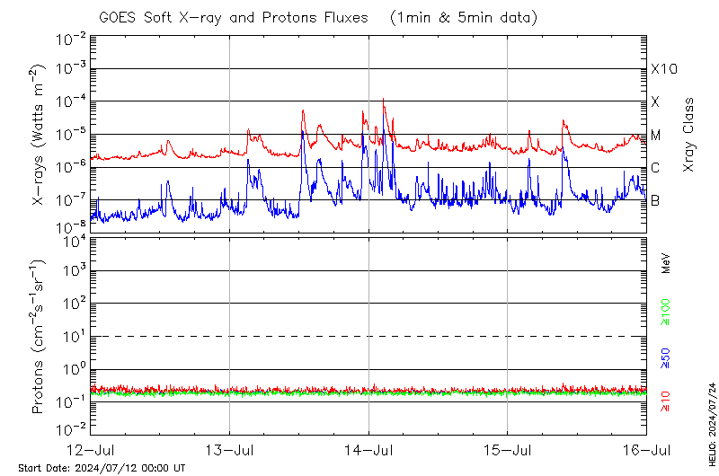 This page provides light-curves generated from GOES soft X-ray and Particle data for the date indicated at the top and the preceding three days.