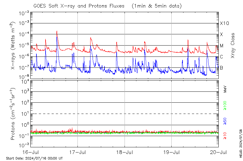 This page provides light-curves generated from GOES soft X-ray and Particle data for the date indicated at the top and the preceding three days.
