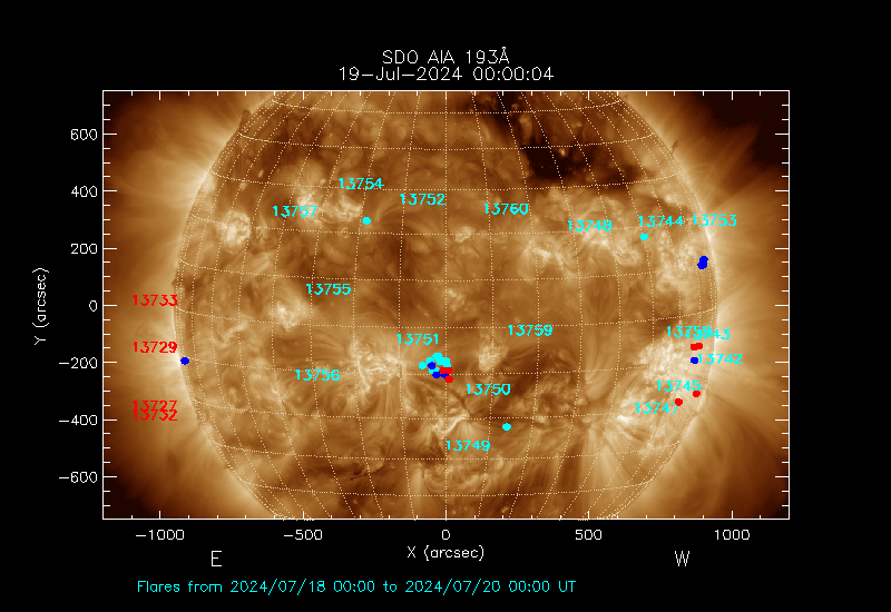 The most recent flares (≤12 hours) are shown as red dots, 12-24 hours ago as blue dots and older ones as turquoise dots.