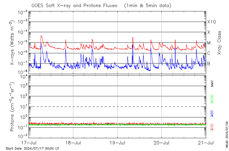 This page provides light-curves generated from GOES soft X-ray and Particle data for the date indicated at the top and the preceding three days.