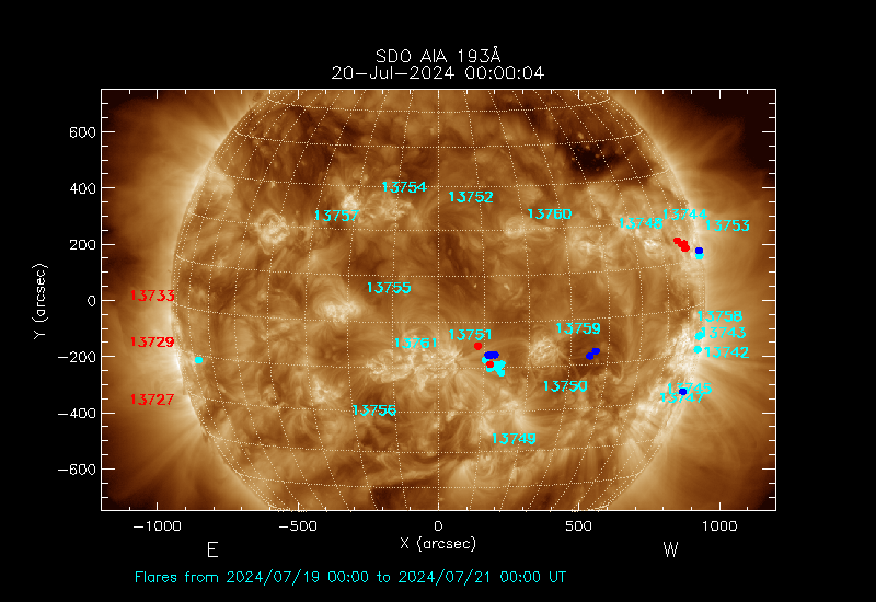 The most recent flares (≤12 hours) are shown as red dots, 12-24 hours as blue