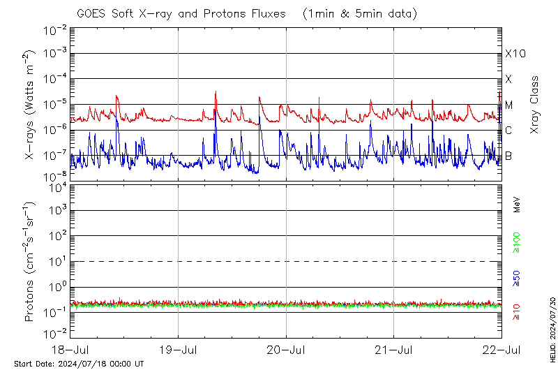 This page provides light-curves generated from GOES soft X-ray and Particle data for the date indicated at the top and the preceding three days.