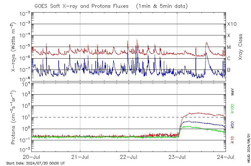 This page provides light-curves generated from GOES soft X-ray and Particle data for the date indicated at the top and the preceding three days.