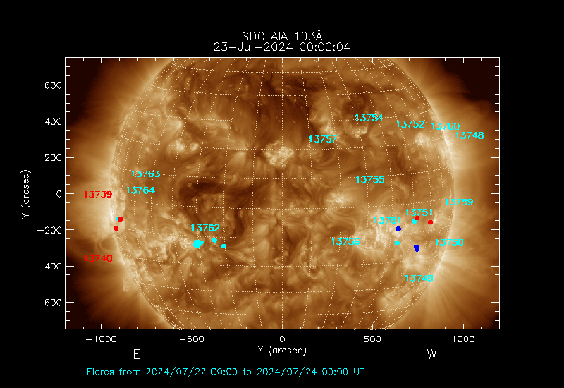 The most recent flares (≤12 hours) are shown as red dots, 12-24 hours ago as blue dots and older ones as turquoise dots.