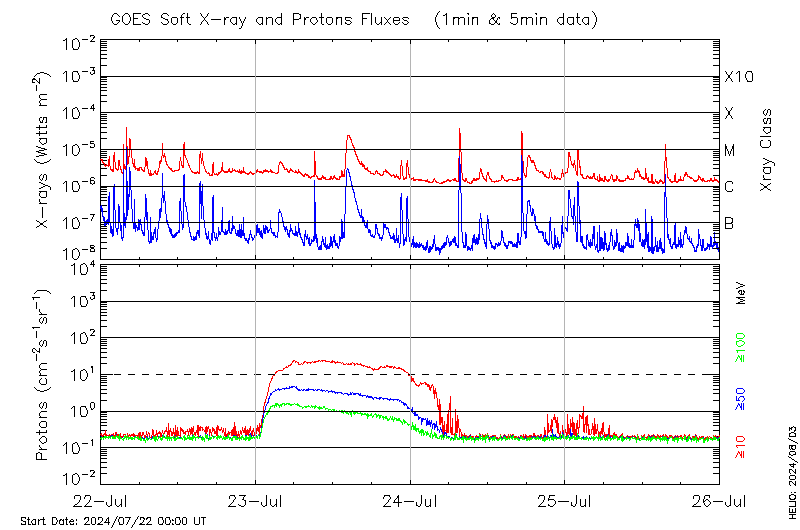 This page provides light-curves generated from GOES soft X-ray and Particle data for the date indicated at the top and the preceding three days.
