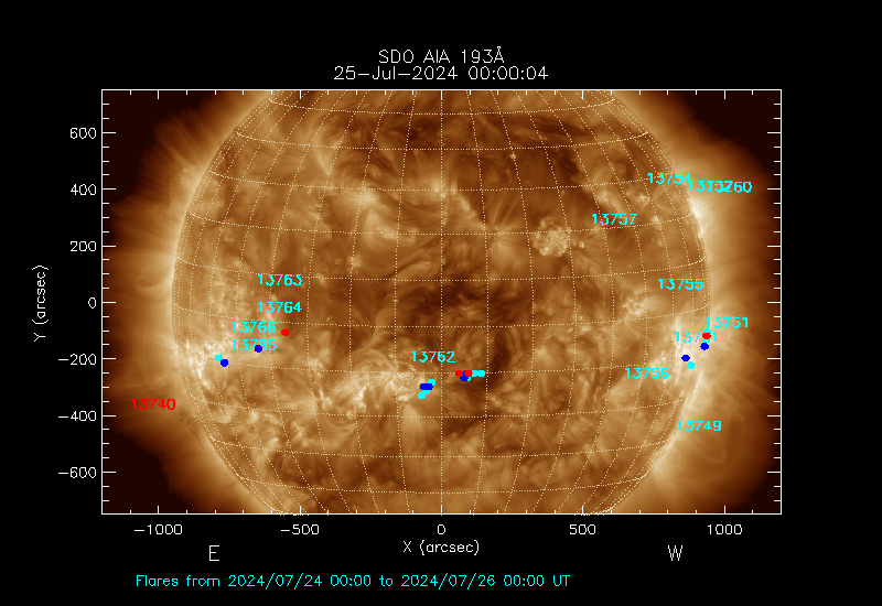The most recent flares (≤12 hours) are shown as red dots, 12-24 hours as blue
