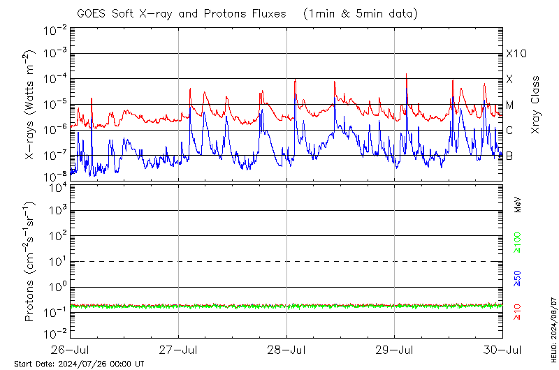 This page provides light-curves generated from GOES soft X-ray and Particle data for the date indicated at the top and the preceding three days.