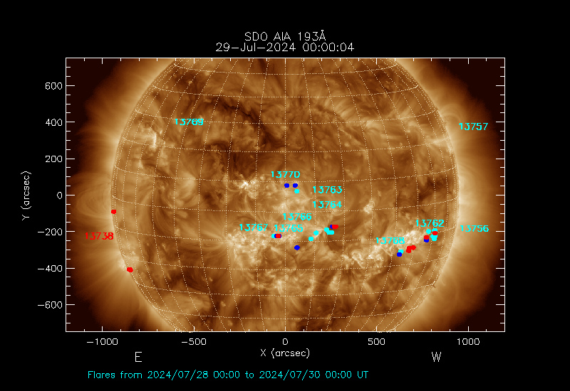 The most recent flares (≤12 hours) are shown as red dots, 12-24 hours ago as blue dots and older ones as turquoise dots.