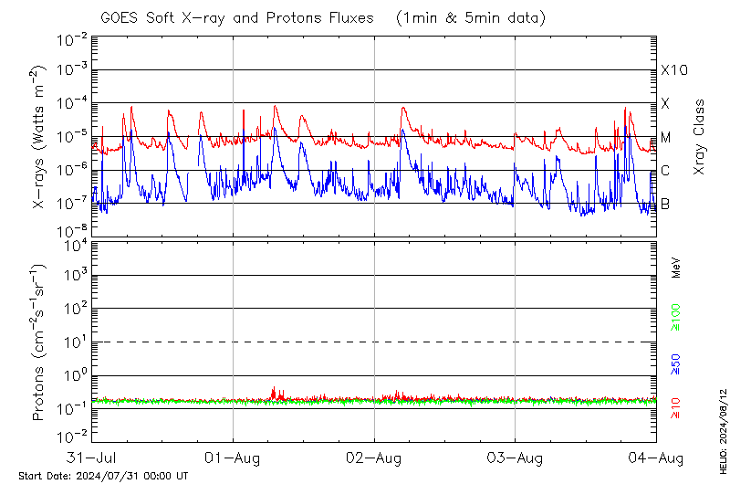 This page provides light-curves generated from GOES soft X-ray and Particle data for the date indicated at the top and the preceding three days.