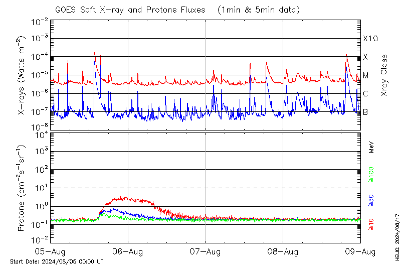 This page provides light-curves generated from GOES soft X-ray and Particle data for the date indicated at the top and the preceding three days.