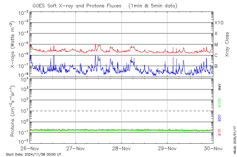 This page provides light-curves generated from GOES soft X-ray and Particle data for the date indicated at the top and the preceding three days.