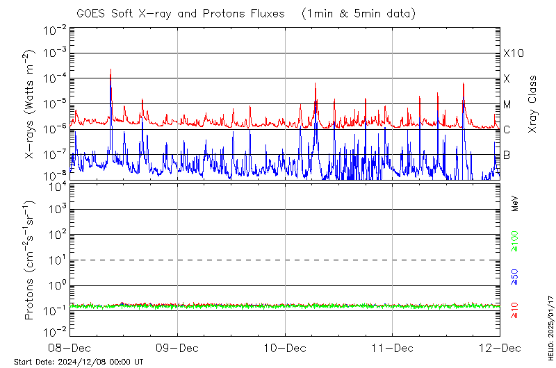 This page provides light-curves generated from GOES soft X-ray and Particle data for the date indicated at the top and the preceding three days.