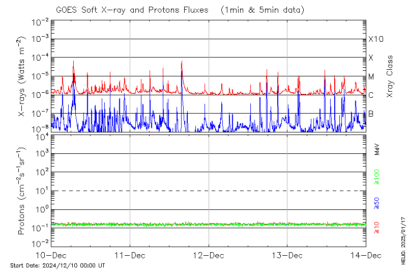 This page provides light-curves generated from GOES soft X-ray and Particle data for the date indicated at the top and the preceding three days.