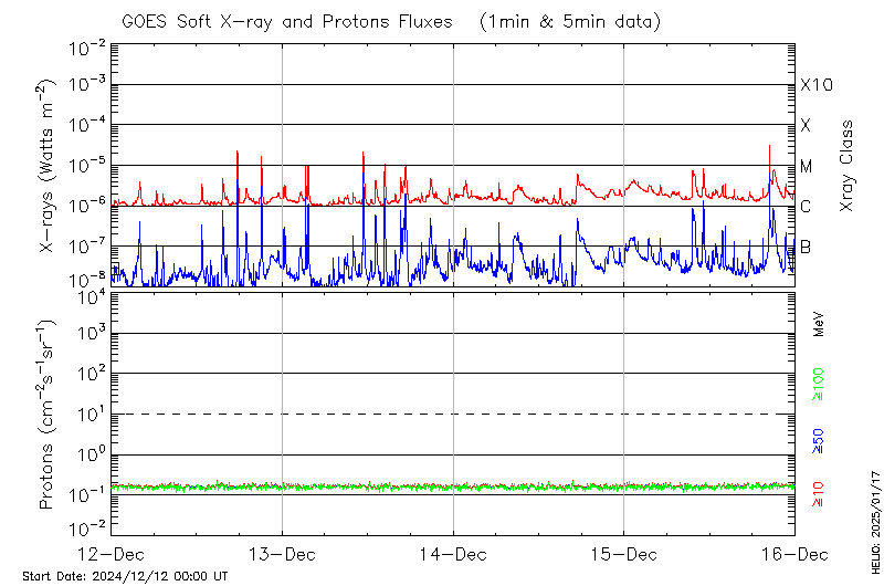 This page provides light-curves generated from GOES soft X-ray and Particle data for the date indicated at the top and the preceding three days.