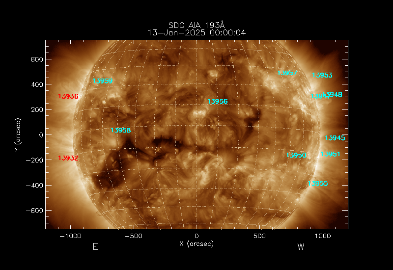 Click on an Active Region plot to display the Region Report including the region evolution and flaring history. HEC Search for NOAA Active Regions (SRS) records for this date and the day before.