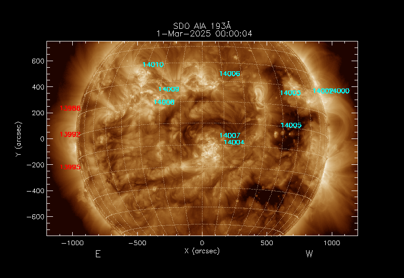 Click on an Active Region plot to display the Region Report including the region evolution and flaring history. HEC Search for NOAA Active Regions (SRS) records for this date and the day before.