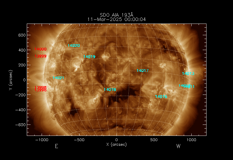 Click on an Active Region plot to display the Region Report including the region evolution and flaring history. HEC Search for NOAA Active Regions (SRS) records for this date and the day before.