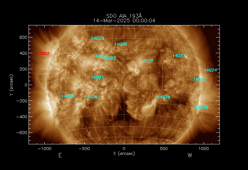 Click on an Active Region plot to display the Region Report including the region evolution and flaring history. HEC Search for NOAA Active Regions (SRS) records for this date and the day before.