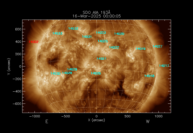 Click on an Active Region plot to display the Region Report including the region evolution and flaring history. HEC Search for NOAA Active Regions (SRS) records for this date and the day before.