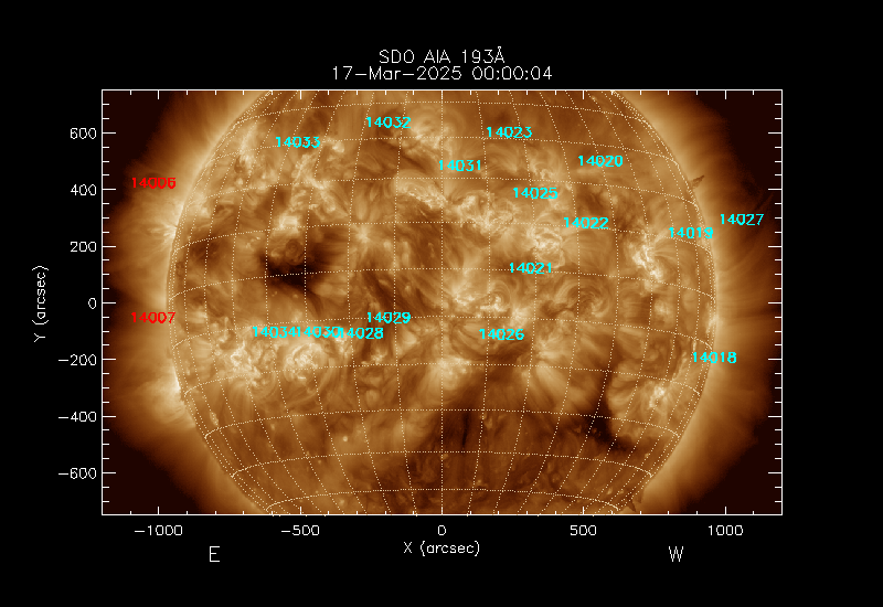 Click on an Active Region plot to display the Region Report including the region evolution and flaring history. HEC Search for NOAA Active Regions (SRS) records for this date and the day before.