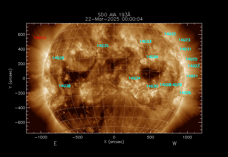 Click on an Active Region plot to display the Region Report including the region evolution and flaring history. HEC Search for NOAA Active Regions (SRS) records for this date and the day before.