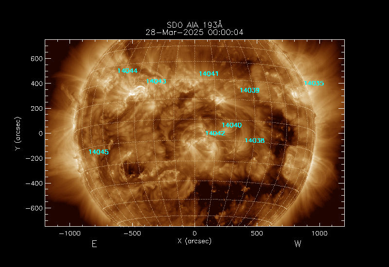 Click on an Active Region plot to display the Region Report including the region evolution and flaring history. HEC Search for NOAA Active Regions (SRS) records for this date and the day before.