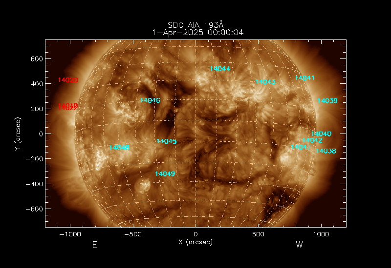 Click on an Active Region plot to display the Region Report including the region evolution and flaring history. HEC Search for NOAA Active Regions (SRS) records for this date and the day before.