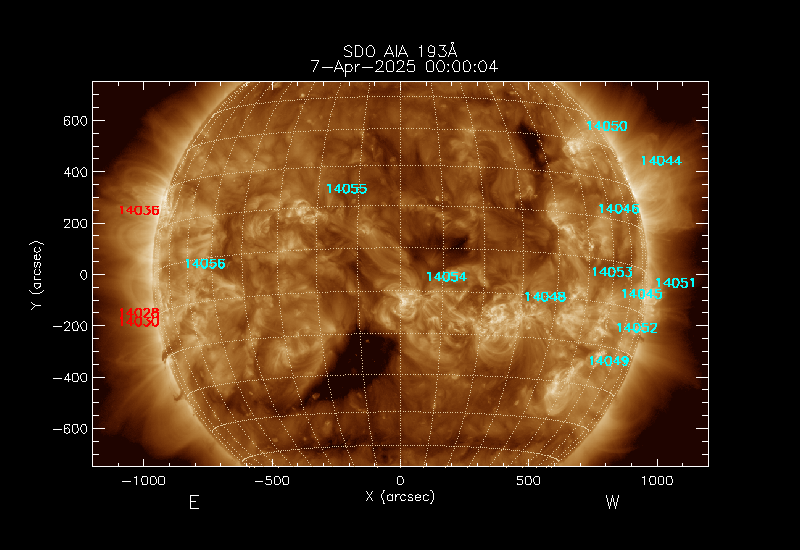 Click on an Active Region plot to display the Region Report including the region evolution and flaring history. HEC Search for NOAA Active Regions (SRS) records for this date and the day before.
