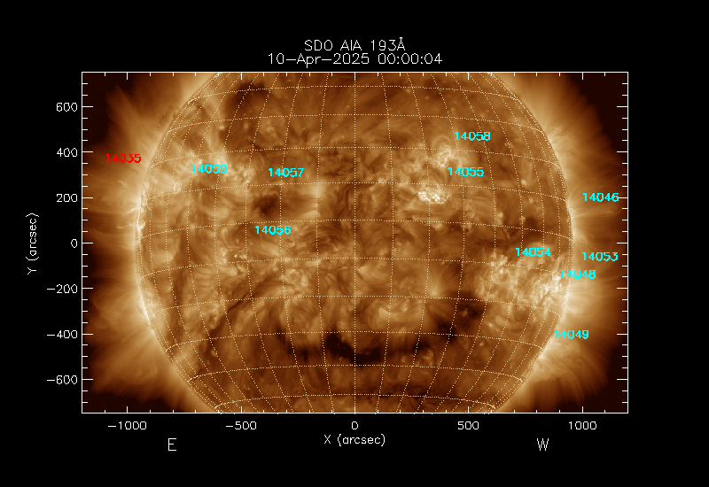 Click on an Active Region plot to display the Region Report including the region evolution and flaring history. HEC Search for NOAA Active Regions (SRS) records for this date and the day before.