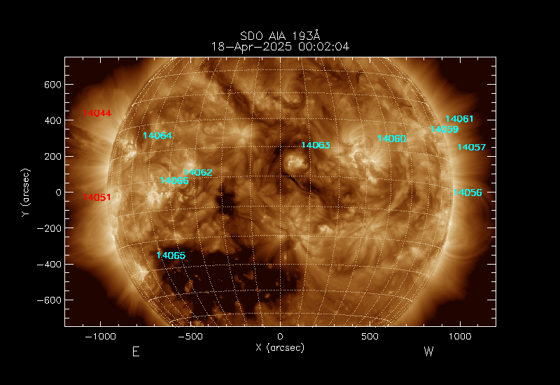 Click on an Active Region plot to display the Region Report including the region evolution and flaring history. HEC Search for NOAA Active Regions (SRS) records for this date and the day before.